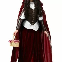 This deluxe costume is 100% exclusive to our site and it puts you into the lead role in your own fairy tale! The women’s costume comes complete with a shirt, corset, skirt, cape, and pair of gauntlets. The shirt is a white peasant style blouse, while the corset, which clasps in front, is made of faux suede that makes the outfit look like something straight out of Grimm’s fairy tales. The skirt and cape are dark red velvet. The only thing this costume doesn’t come with are all the goodies you’re going to need to bring to your grandmother’s house, so make sure to pick up her favorite snacks before you even think about stepping foot into the forest.