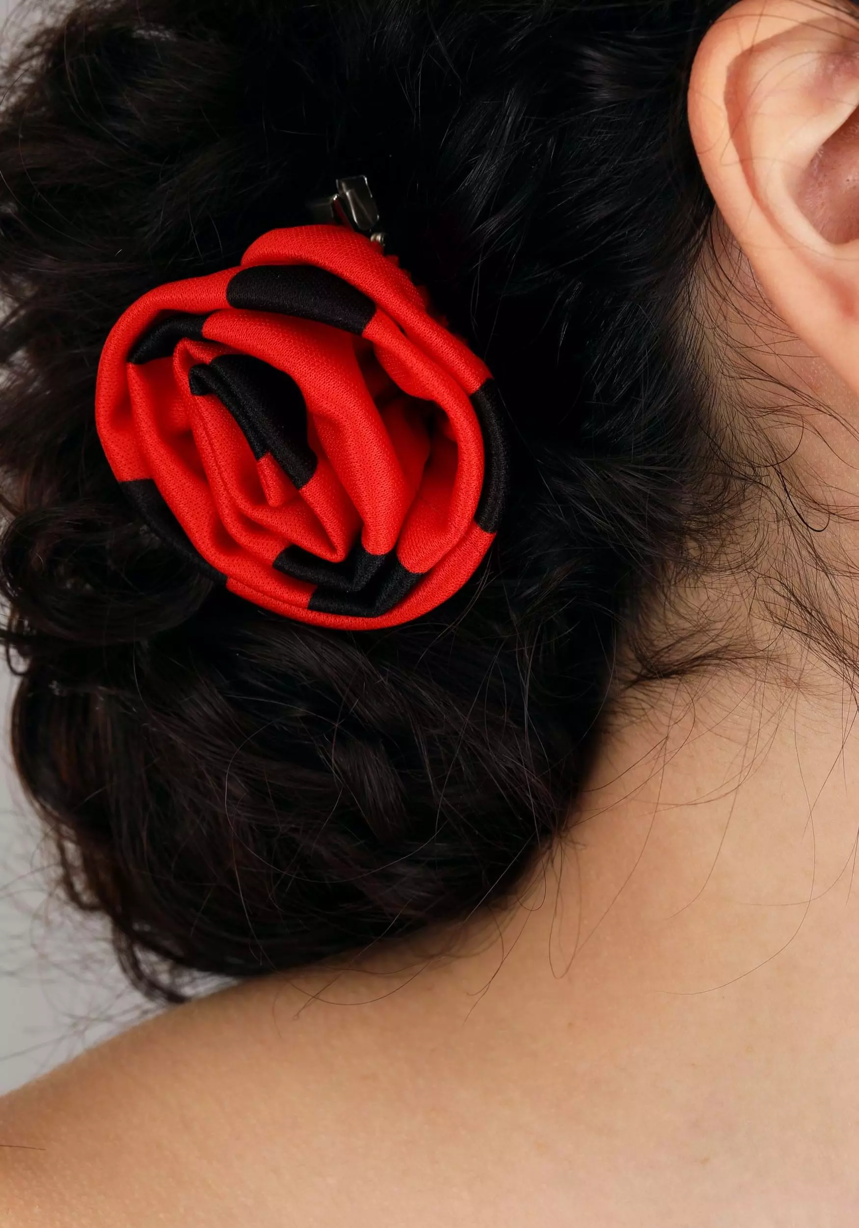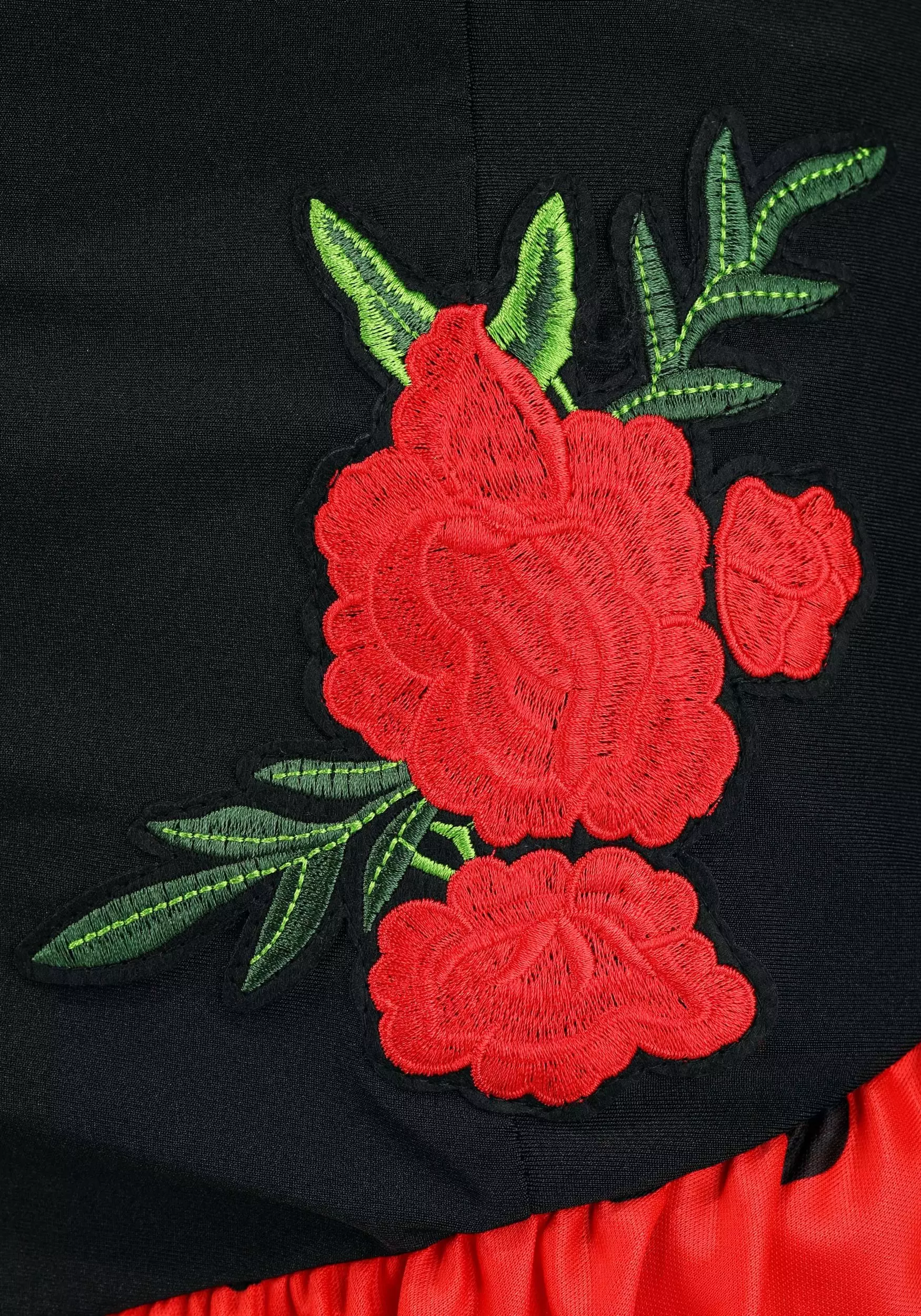Our design studio definitely captured the essence of the era in this exclusive costume! Everything about this dress screams “dramatic entrance!” It’s an off-the-shoulder look, with ruffled flared sleeves and an asymmetrically-cut black bodice, adorned with red roses. The ruffled, tiered skirt cascades to the floor on one side of the dramatic side slit. Red-and-black polka dots adorn the skirt, sleeves, and matching hair piece. Grab yourself a fan and a pair of high heels, because this is a look made for center stage!